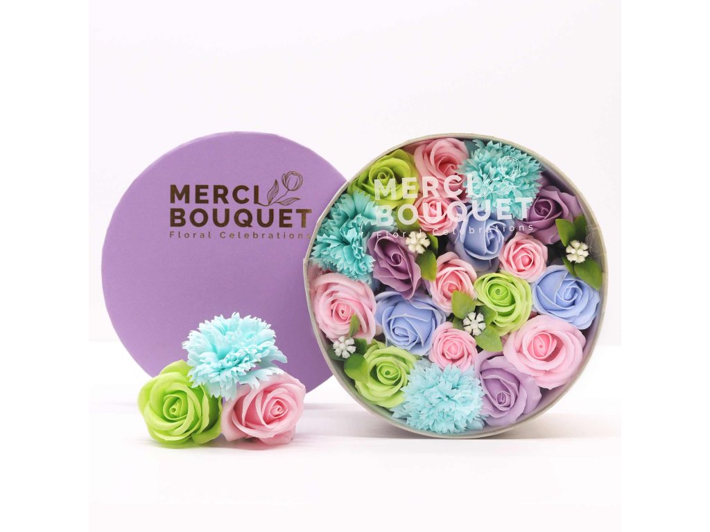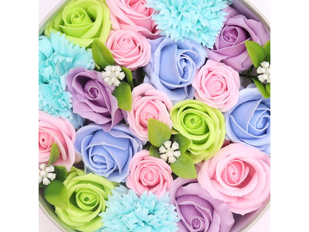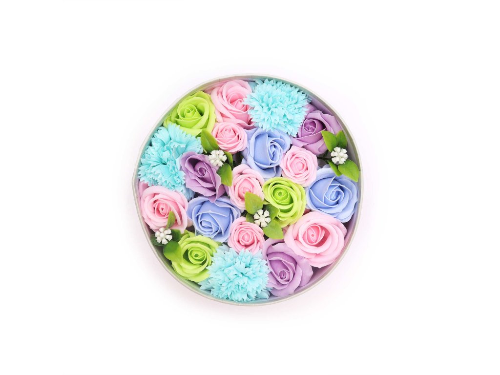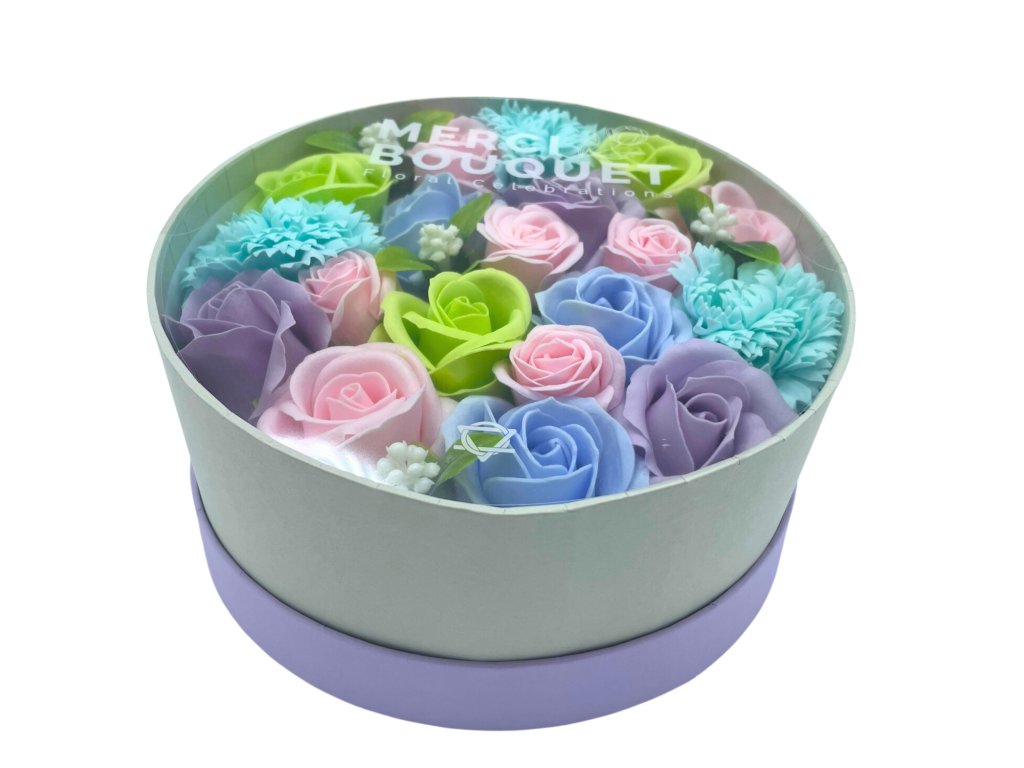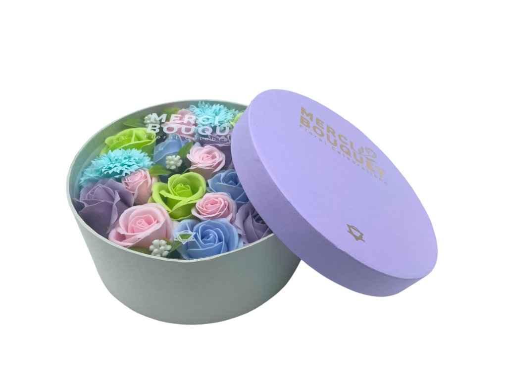 Mydlové kvety Okrúhly Box - Modrý je nežný a elegantný darček, ktorý poteší pri akejkoľvek príležitosti. Jemné odtiene modrej a bielej vytvárajú harmonickú kvetinovú kompozíciu, ktorá pôsobí štýlovo a romanticky. Mydlové kvety vyzerajú ako skutočné, no pri kontakte s vodou sa premenia na voňavú penu. Tento originálny darček zaujme nielen svojím vzhľadom, ale aj praktickým využitím – kvety môžete použiť na relaxačný kúpeľ alebo ako elegantné mydlá pre hostí. Každý box je starostlivo naaranžovaný a krásne zabalený, pripravený okamžite darovať. Ideálna voľba na narodeniny, meniny, Valentína, svadby, Deň žien či len tak – pre potešenie blízkej osoby.
